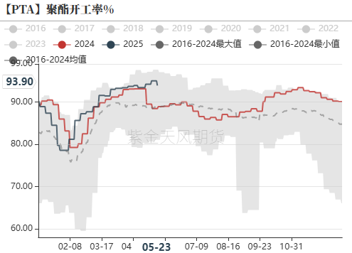 聚酯负荷持稳,目前来看长丝负荷持稳,短纤整体高位,瓶片负荷低位恢复较快。截至23日,聚酯负荷93.9%,5-6月负荷预估94.5%、91.5%。