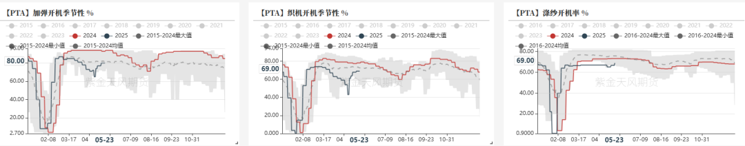 需求端,聚酯高开工,有减产传闻,截至5.23日负荷93.9%,5-6月开工评估94.5%、91.5%。下游备货偏高,织造负荷持稳,加弹、织造、印染负荷80%(-)、69%(+1%)和77%(-)。