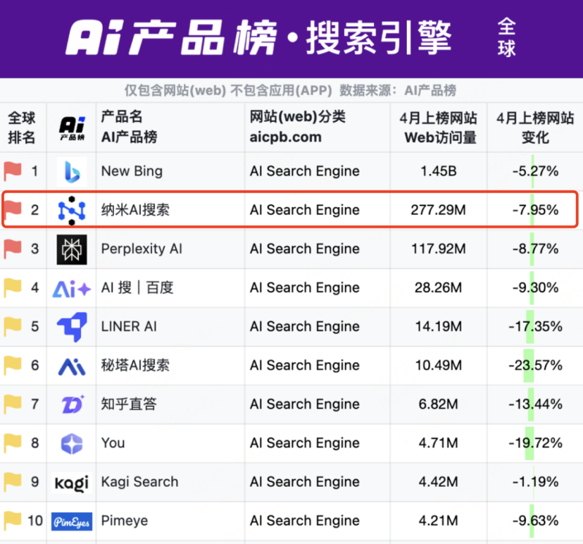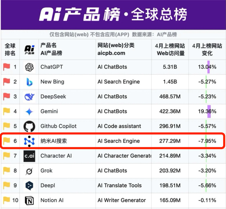 第三方机构 aicpb.com最新发布的 AI 产品榜 4 月榜单中,纳米 AI 搜索已经超越百度,拿下中国 AI 搜索榜首,仅次于微软 New Bing,位列全球第二。全球 AI 产品总榜(Web 端)中,纳米 AI 搜索也成为继 DeepSeek 后唯二位列全球排名前十的 AI 产品。