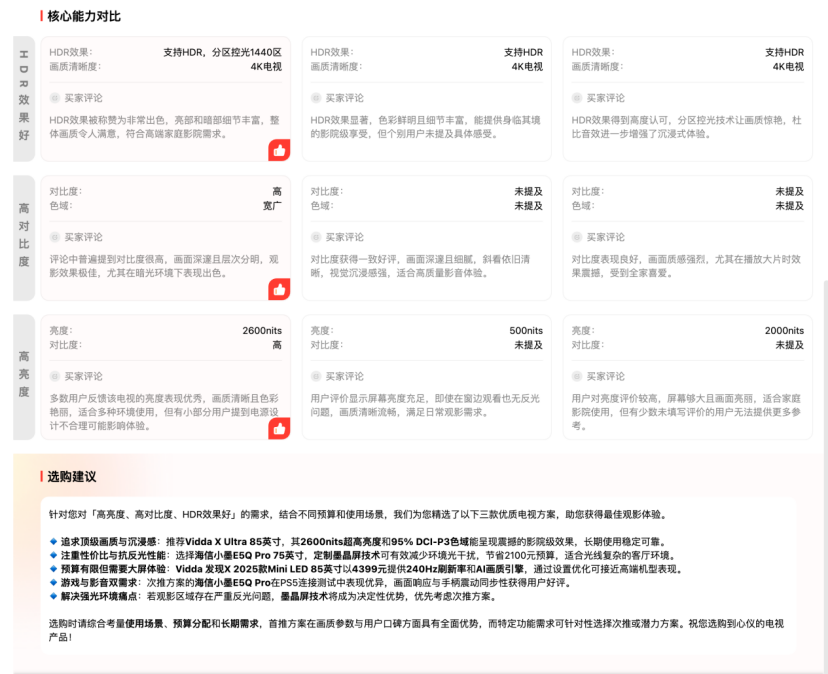 传统的搜索引擎或者只是单纯加入了大模型思考能力的 AI 搜索,在遇到这种复杂冗长的需求面前,往往只能给出一个宽泛的选购建议。比如,以下两个回答分别选自另外两个 AI 搜索产品。