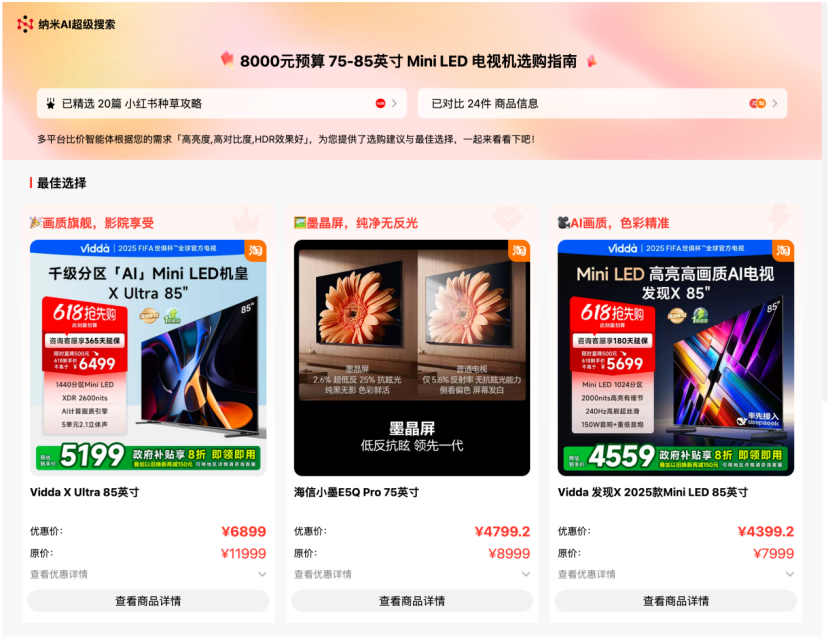 在浏览完淘宝、京东等电商网站并对比商品价格、用户评价之后,纳米AI会最终生成一个可视化的选购指南,甚至还能一键帮你加入购物车——这和谷歌在 I/O 开发者大会上展示的 AI Mode 功能几乎没有什么区别。