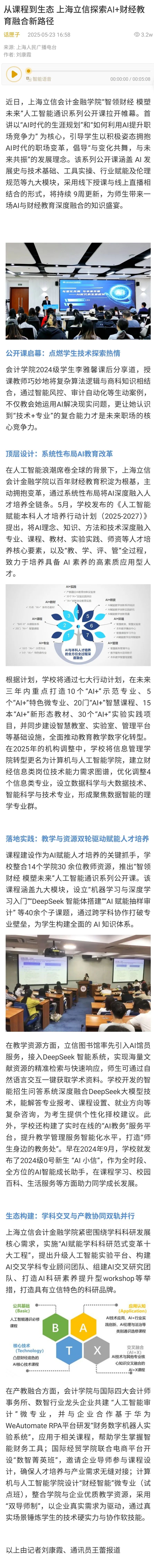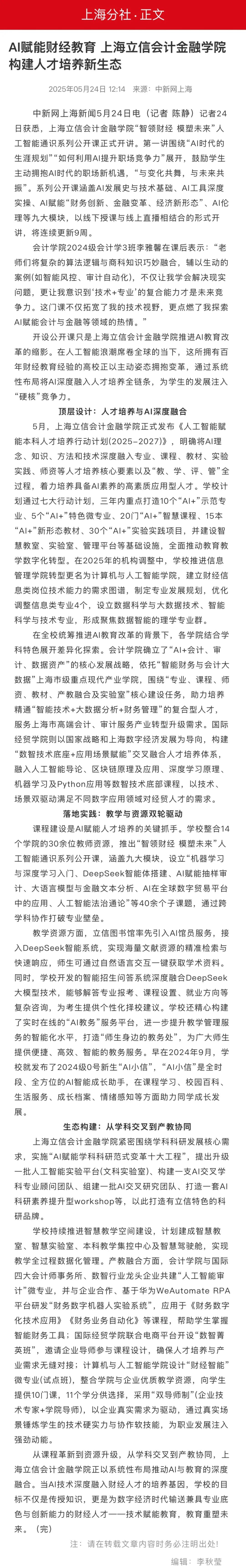 从课程革新到资源升级,从学科交叉到产教协同,上海立信会计金融学院正以系统性布局推动AI与教育的深度融合。当AI技术深度融入财经人才的培养基因,学校的目标不仅是传授知识,更是为数字经济时代输送兼具专业底色与创新能力的财经人才——技术赋能教育,教育重塑未来。