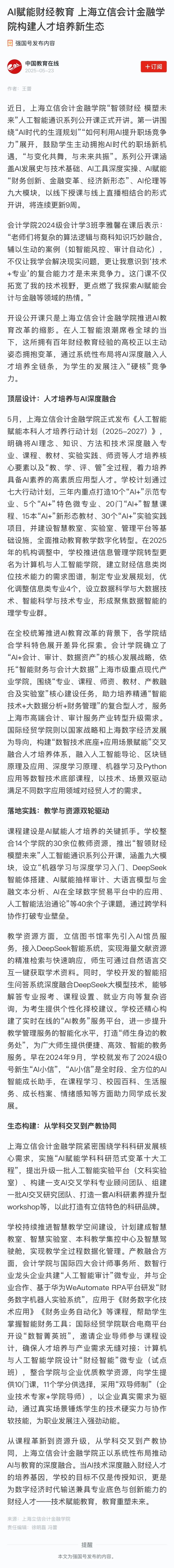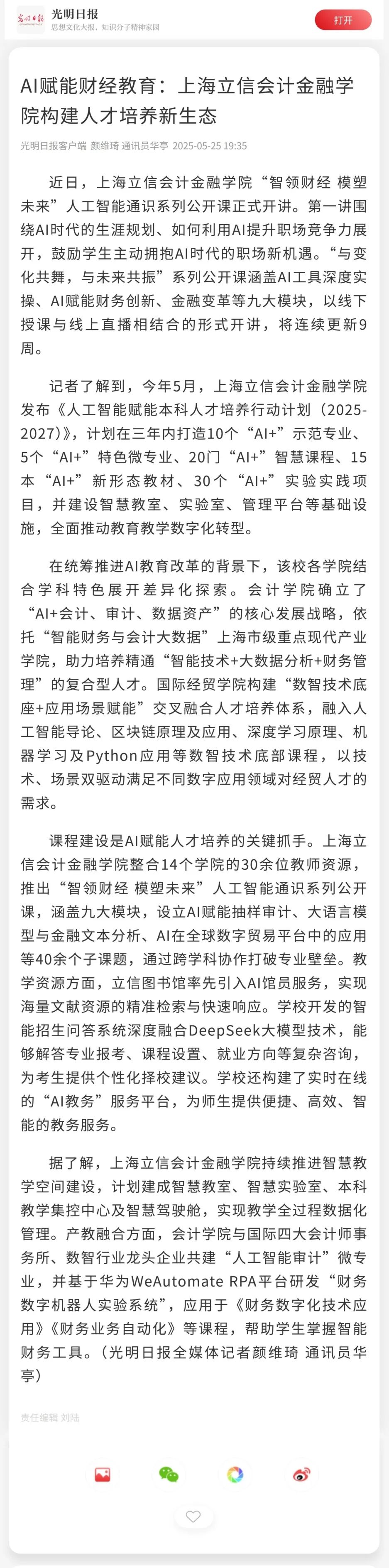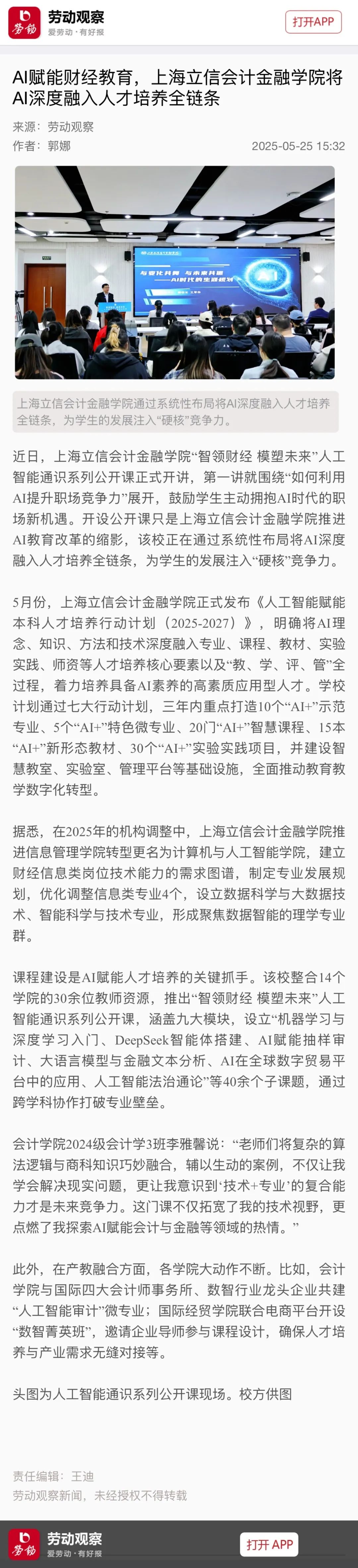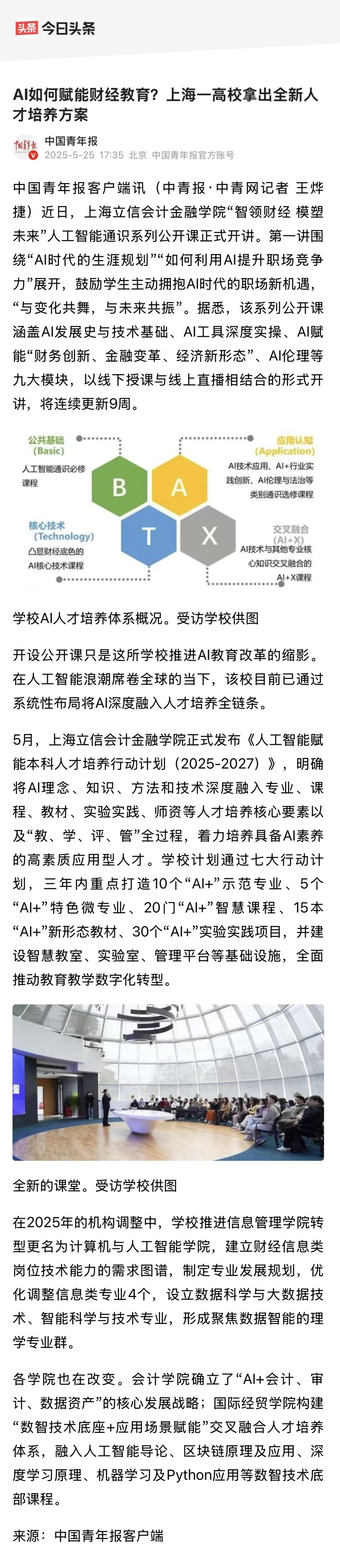 5月,上海立信会计金融学院正式发布《人工智能赋能本科人才培养行动计划(2025-2027)》,明确将AI理念、知识、方法和技术深度融入专业、课程、教材、实验实践、师资等人才培养核心要素以及“教、学、评、管”全过程,着力培养具备AI素养的高素质应用型人才。学校计划通过七大行动计划,三年内重点打造10个“AI+”示范专业、5个“AI+”特色微专业、20门“AI+”智慧课程、15本“AI+”新形态教材、30个“AI+”实验实践项目,并建设智慧教室、实验室、管理平台等基础设施,全面推动教育教学数字化转型。在2025年的机构调整中,学校推进信息管理学院转型更名为计算机与人工智能学院,建立财经信息类岗位技术能力的需求图谱,制定专业发展规划,优化调整信息类专业4个,设立数据科学与大数据技术、智能科学与技术专业,形成聚焦数据智能的理学专业群。